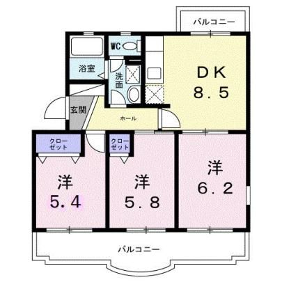 | 築年月 | 2005年9月 | 間取り | 3DK( 洋室5.4畳/洋室5.8畳/洋室6.2畳/DK8.5畳 ) | 専有面積 | 55.6m2 |